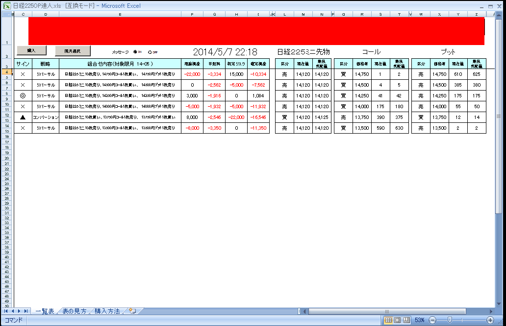 利益 ¥3,312円 日経225ミニ 14090 10枚×売 、 コール14500 4円 1枚×買 、 プット14500 420円 1枚×売